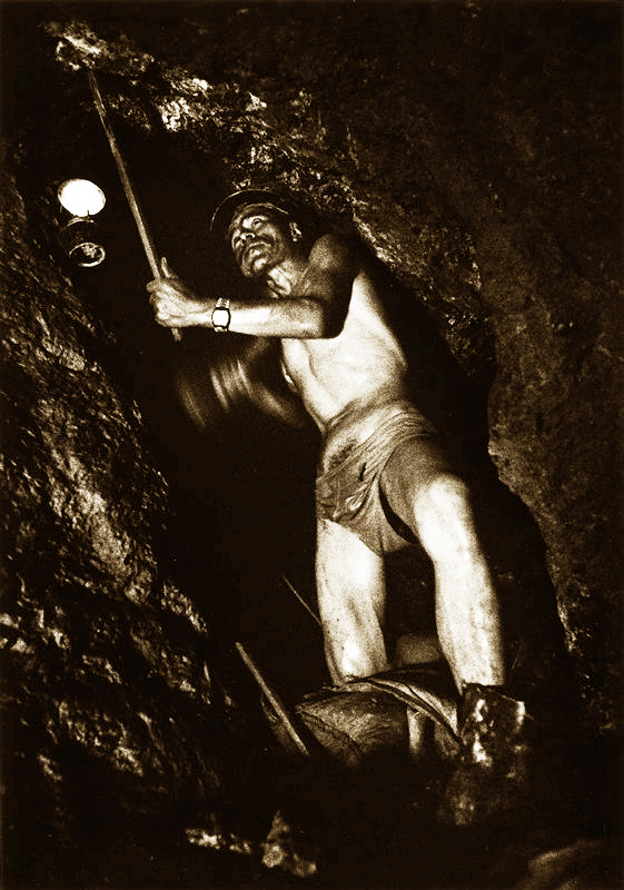 En estas galerías, semejantes a las catacumbas del averno, los mineros, que lucen las extremidades con las venas enraizadas como cuerdas debajo de la piel, no tienen el cuerpo cubierto de polvo sino de sudor, de un sudor que parece mojarles hasta los pulmones convertidos en coladeras por el polvo de sílice.