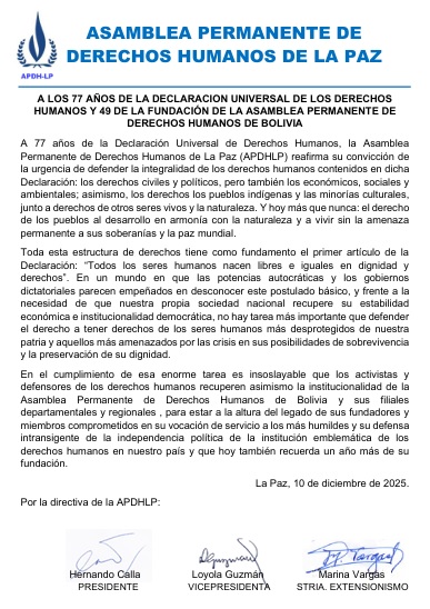 El documento está firmado por Hernando Calla (presidente), Loyola Guzmán (vicepresidenta) y Marina Vargas (Secretaría de Extensionismo), en representación de los activistas y defensores de la APDHLP, quienes a tiempo de recordar un año más de la fundación de la Asamblea Permanente de Derechos Humanos de Bolivia, hace un llamado para recuperar su institucionalidad y la de sus filiales departamentales y regionales, “para estar a la altura del legado de sus fundadores y miembros comprometidos en su vocación de servicio a los más humildes y la defensa intransigente de su independencia política”.