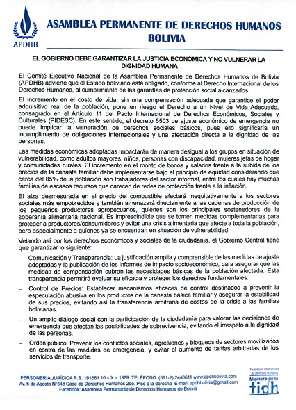 La Asamblea Permanente de Derechos Humanos de Bolivia (APDHB) ha emitido un pronunciamiento donde manifiesta su preocupación por el Decreto Supremo Nro. 5503 que establece medidas de ajuste económico de emergencia. La institución advierte que el alza en el costo de vida producto de quitar la subvención a los carburantes, sin mecanismos que protejan el poder adquisitivo, vulnera el derecho a una vida digna reconocido internacionalmente. Según la APDHB, esta situación no solo afecta las condiciones materiales de miles de familias, sino que compromete la dignidad humana como eje central de las políticas públicas estatales.