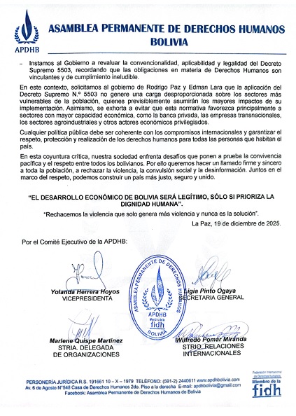 Asimismo, la APDHB recordó que Bolivia debe cumplir con el Pacto Internacional de Derechos Económicos, Sociales y Culturales. Advirtió que la aplicación de dicho decreto podría vulnerar derechos sociales básicos e incumplir compromisos internacionales en perjuicio de la población.