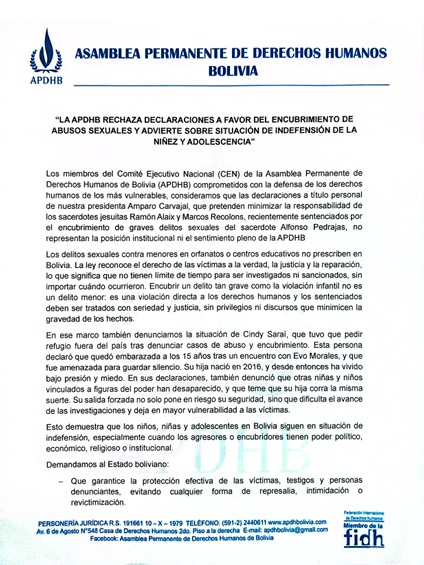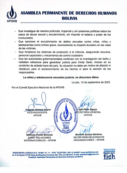 El Comité Ejecutivo Nacional (CEN) de la Asamblea Permanente de Derechos Humanos de Bolivia (APDHB), en un pronunciamiento publicó, señaló que los delitos sexuales contra menores no prescriben en Bolivia y que la ley garantiza el derecho de las víctimas a la verdad, justicia y reparación; además señala que encubrir estos delitos es una violación directa de los derechos humanos.