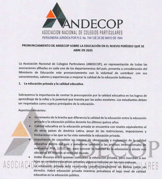 Dentro de este marco, la Asociación Nacional de Colegios Particulares (ANDECOP) ha emitido un pronunciamiento “sobre la educación en el nuevo período que se abre”, documento que ha sido entregado a las autoridades educativas del nuevo gobierno, el pasado viernes, donde proponen medidas a tomar como también exponen demandas, a fin de que mejore la calidad de la educación boliviana. El documento fue entregado por la presidenta de ANDECOP, Patricia Marín, al Viceministro de Educación, Juan Carlos Pimentel.