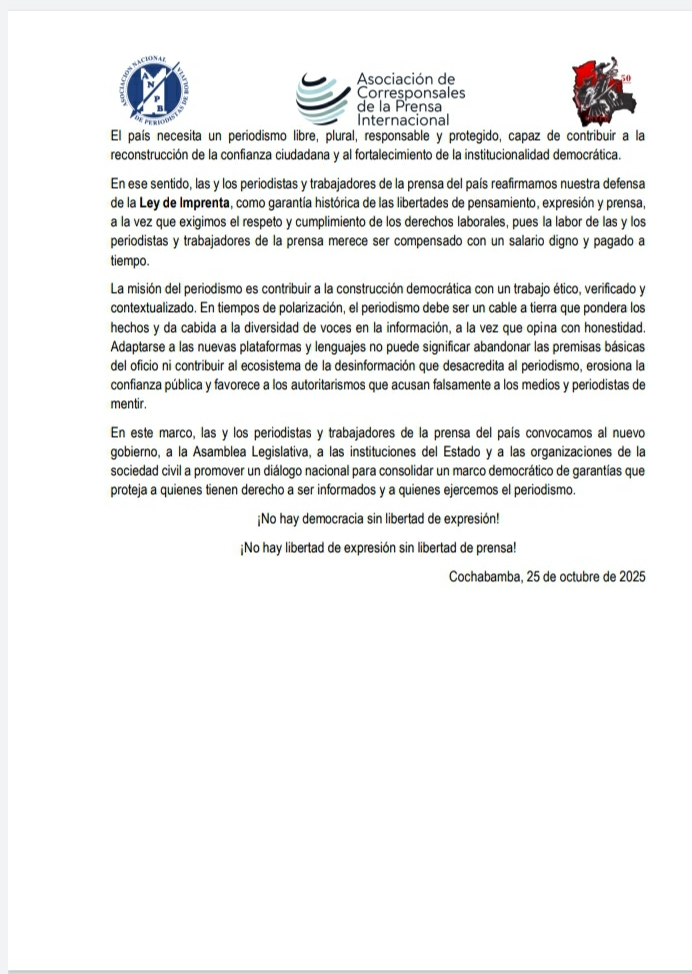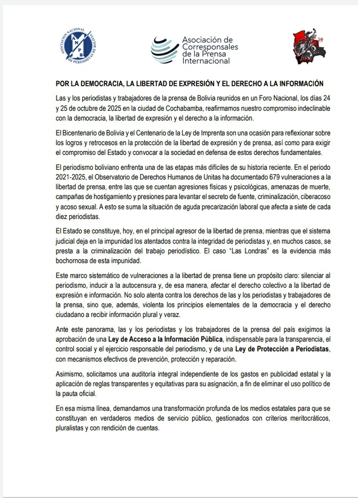 Periodistas y trabajadores de la prensa de Bolivia reunidos en un Foro Nacional, los días 24 y 25 de octubre de 2025 en la ciudad de Cochabamba, han emitido un pronunciamiento donde reafirman su compromiso con la democracia, la libertad de expresión y el derecho a la información.