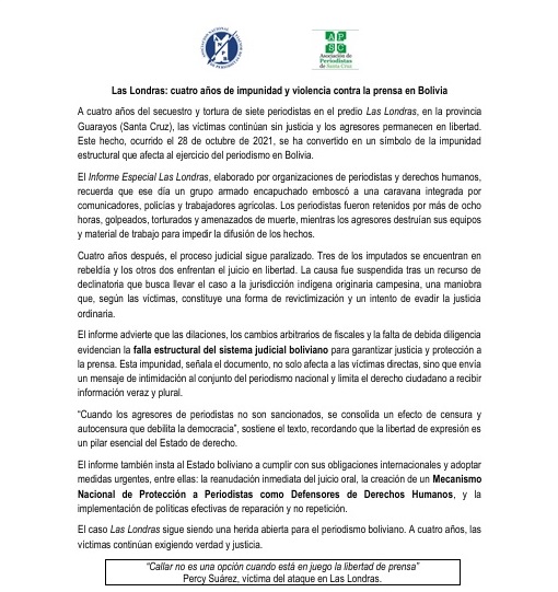 La Asociación Nacional de Periodistas de Bolivia y la Asociación de Periodistas de Santa Cruz se han pronunciado este 28 de octubre, a cuatro años del “secuestro y tortura de siete periodistas en el predio Las Londras (28/10/2021), en la provincia Guarayos (Santa Cruz)” dado que “las víctimas continúan sin justicia y los agresores permanecen en libertad”.